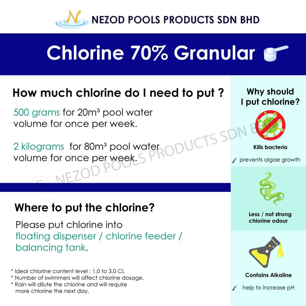 500grams for 20m³ pool water volume. Frequency of once per week. Raining will dilute the chlorine treatment and required to add the next day.