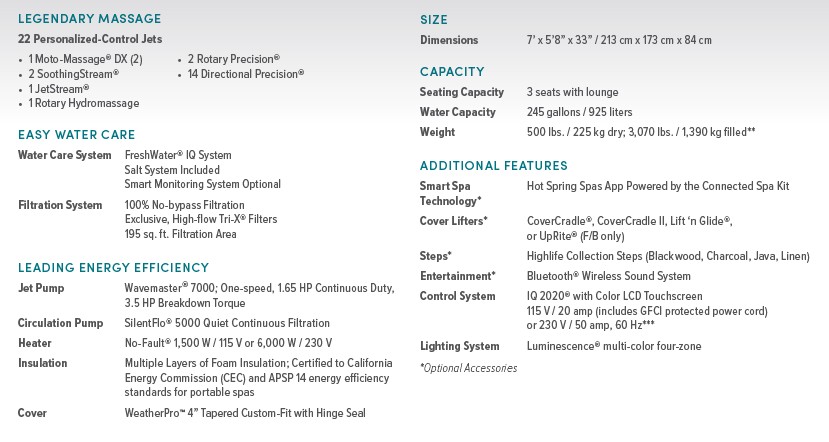 Designed for small spaces and easy installation, the Jetsetter is a 3-seat luxury spa that can operate on either 115 or 230 volts and fits through a standard doorway.