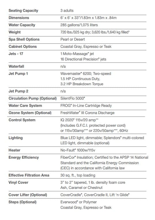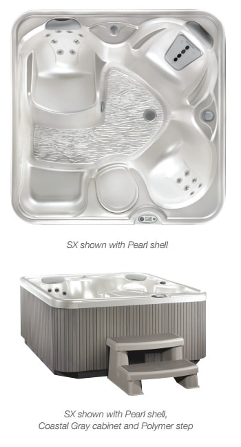 The 3-person SX spa comes complete with a Moto-Massage® jet and all of the outstanding features that normally come in a full-size Hot Spring spa. This model includes a No-Fault® heater, and FiberCor® insulation.