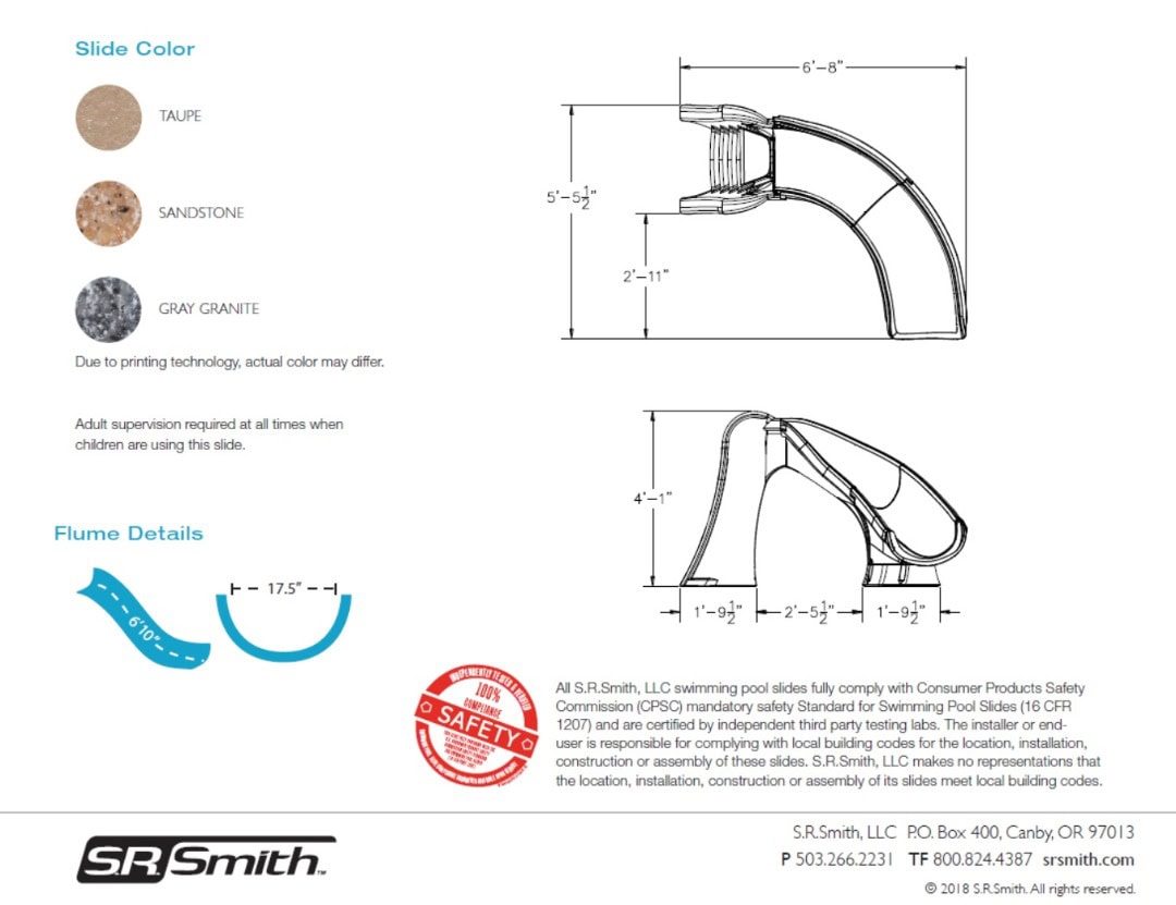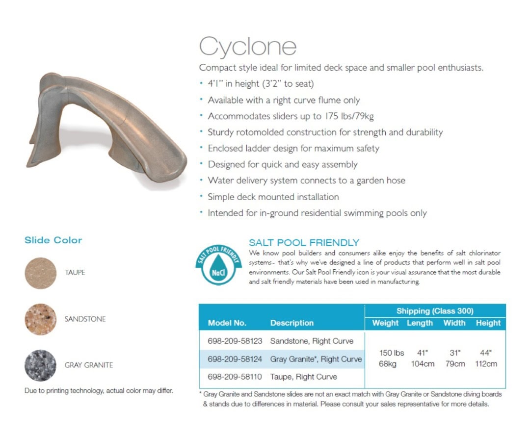 S.R.Smith’s Cyclone water slide will make a big splash with the little one’s that enjoy your pool! The Cyclone incorporates many of the same great features of our Turbo Twister, but in smaller proportions at just 4-Feet 1-Inch tall. Loaded with safety features like molded in handrails, enclosed ladder and with little exposed metal, this slide is perfect for chlorine or salt pools. water delivery system connects through a garden hose Available as a right curve slide only in taupe, sandstone and gray granite designer colors to match the latest in backyard decor. Accommodates children and adults up to 175 lbs. This slide fully complies with the consumer product safety commission’s safety standard for swimming pool slides (16 C.F.R. 1207) and is intended for in-ground pools.